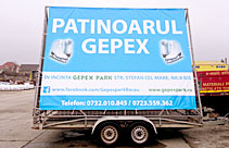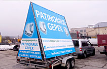Remorca personalizata - atat spatele remorcii publicitare cat si ramele care incadreaza cele doua laturi ale remorcii, pot fi personalizate cu informatii importante pentru client.